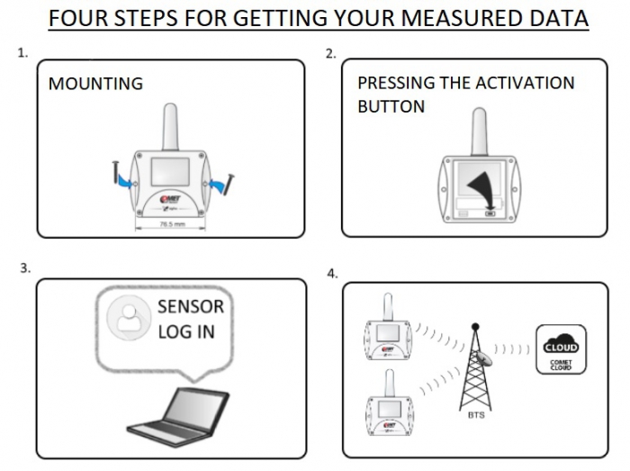 Los valores medidos se envían en un intervalo de tiempo configurable (de 10 min a 24 h) por radio en la red Sigfox a la nube COMET Cloud, desde la que el usuario puede visualizarlos mediante un ordenador personal o un dispositivo móvil.